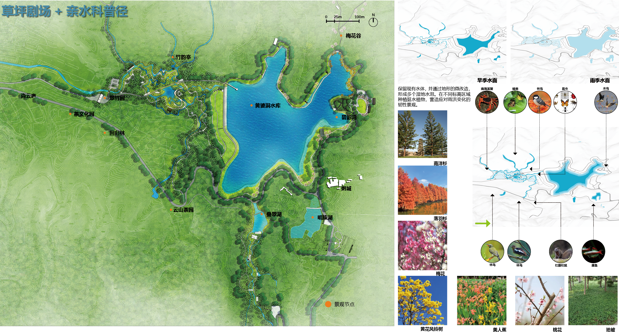 设计分析现场水文信息,保留现有水体,并通过地形的微改造,形成多个湿地水泡。在不同标高区域种植挺水植物,营造应对雨洪变化的韧性景观。