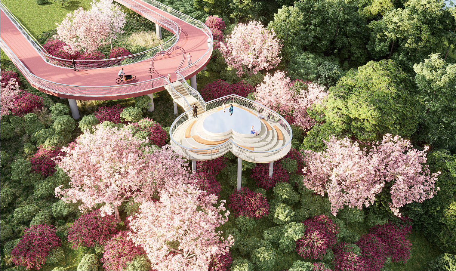 植物配置:结合西北 / 北侧山坡地形,步道两侧以中性 / 中生性耐阴植物为主,观景台两侧以粉色系开花乔灌为核心;乔木选用乌桕、朴树、宫粉紫荆等,灌木含冬青卫矛、勒杜鹃、粉花野牡丹等,草本搭配大吴风草、海马齿、天门冬等。