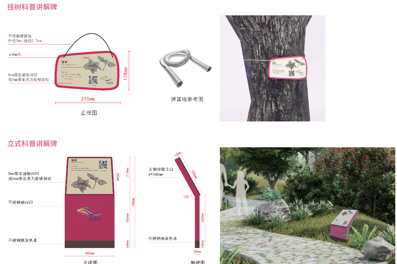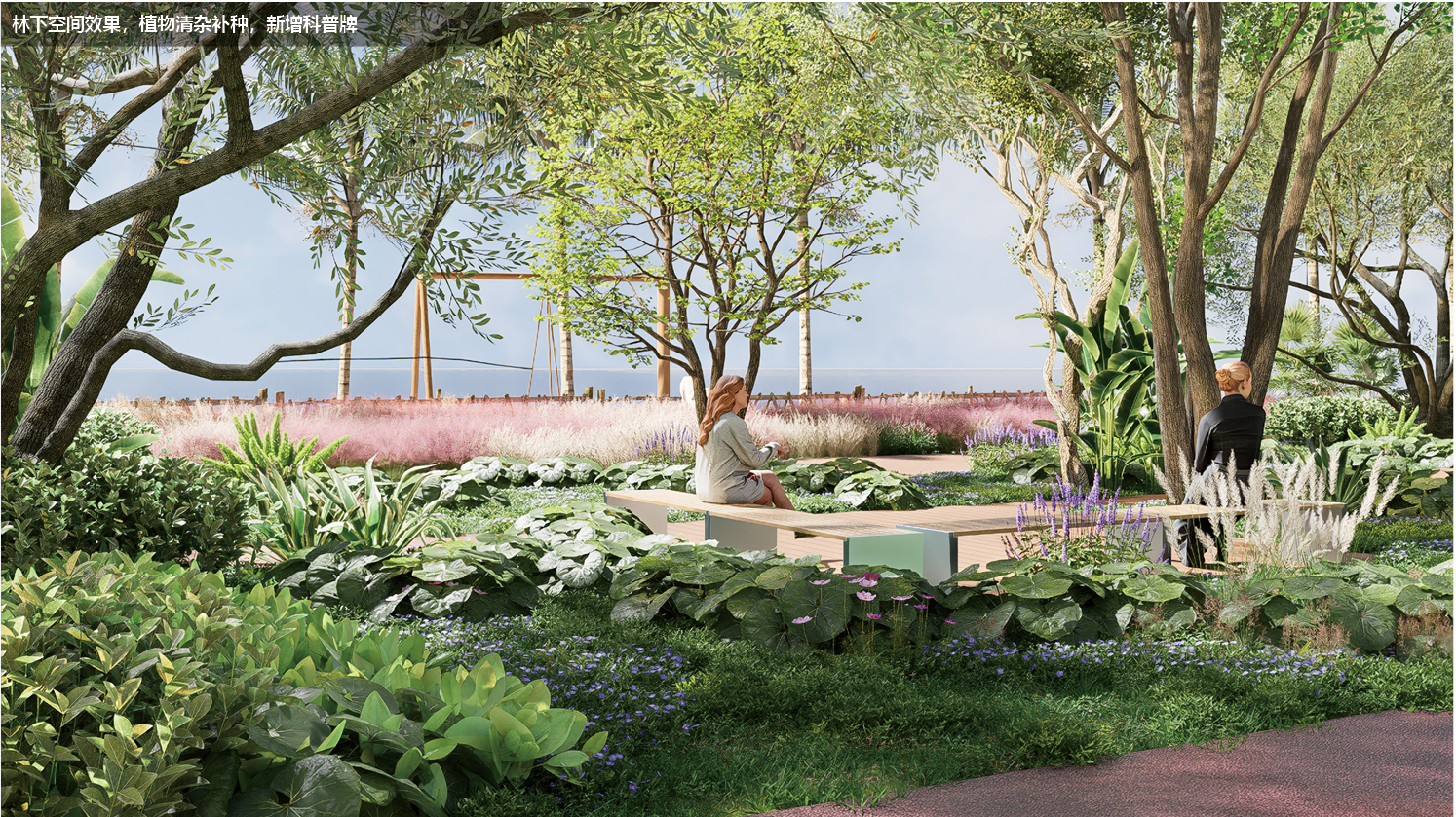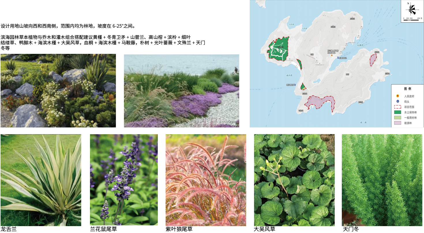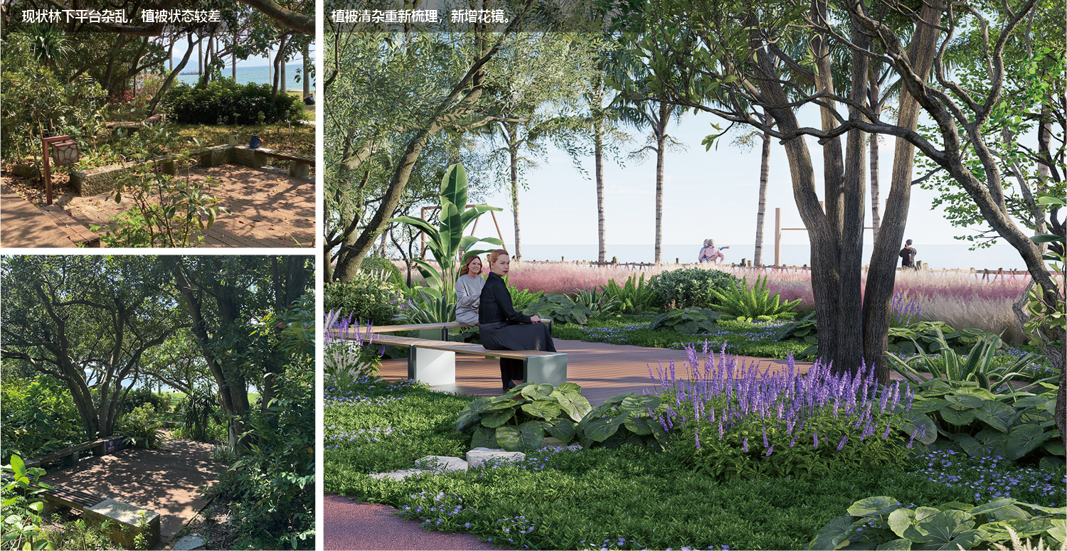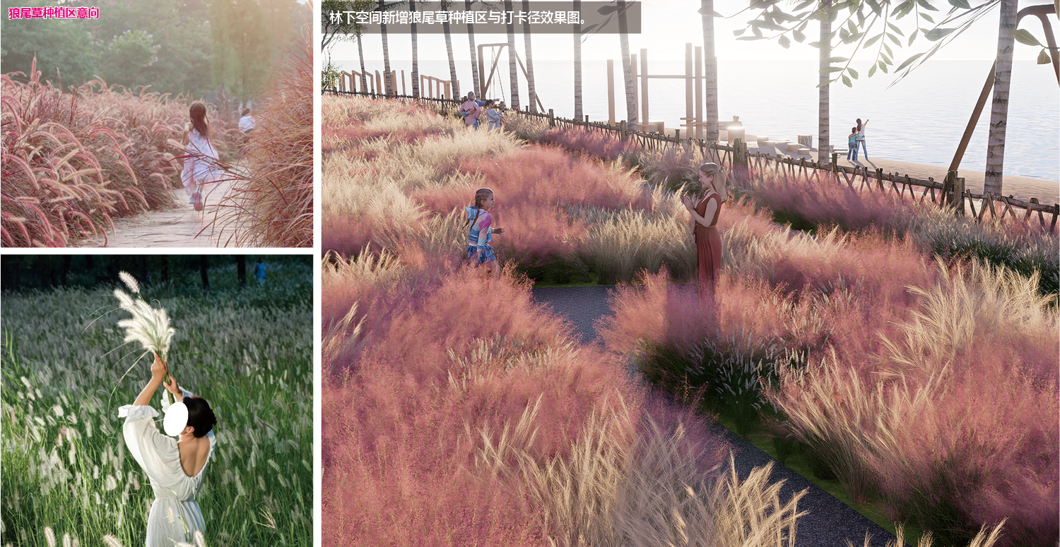 植物配置:适配西 / 西南侧林地地形,采用滨海园林植物组合搭配,采用龙舌兰,海桐,鸭脚木,海滨木槿,大吴风草,海滨雀稗等多组乔灌草搭配方案,并构建狼尾草观景廊,兼顾滨海适应性与景观层次,并增加标识牌。