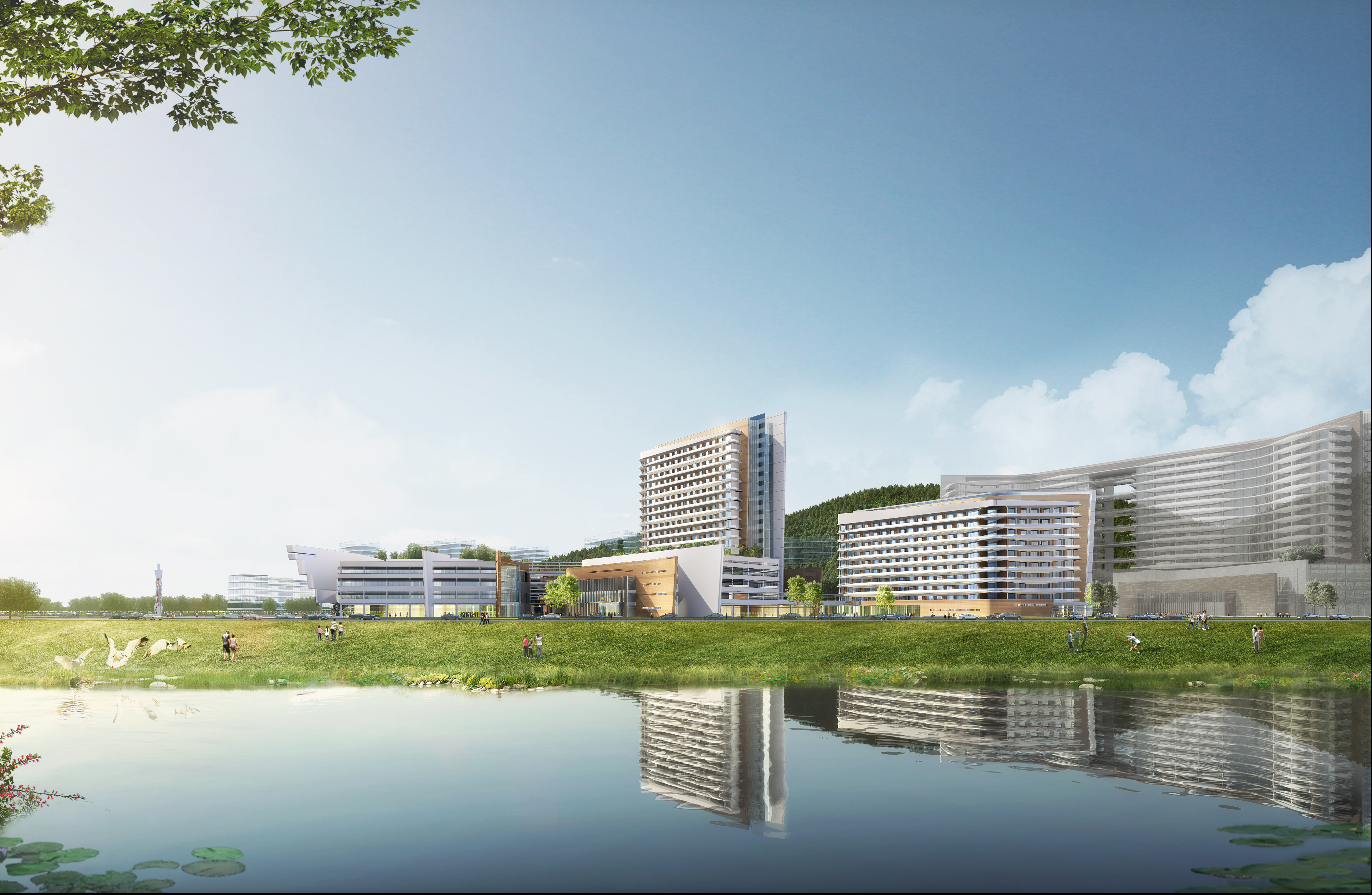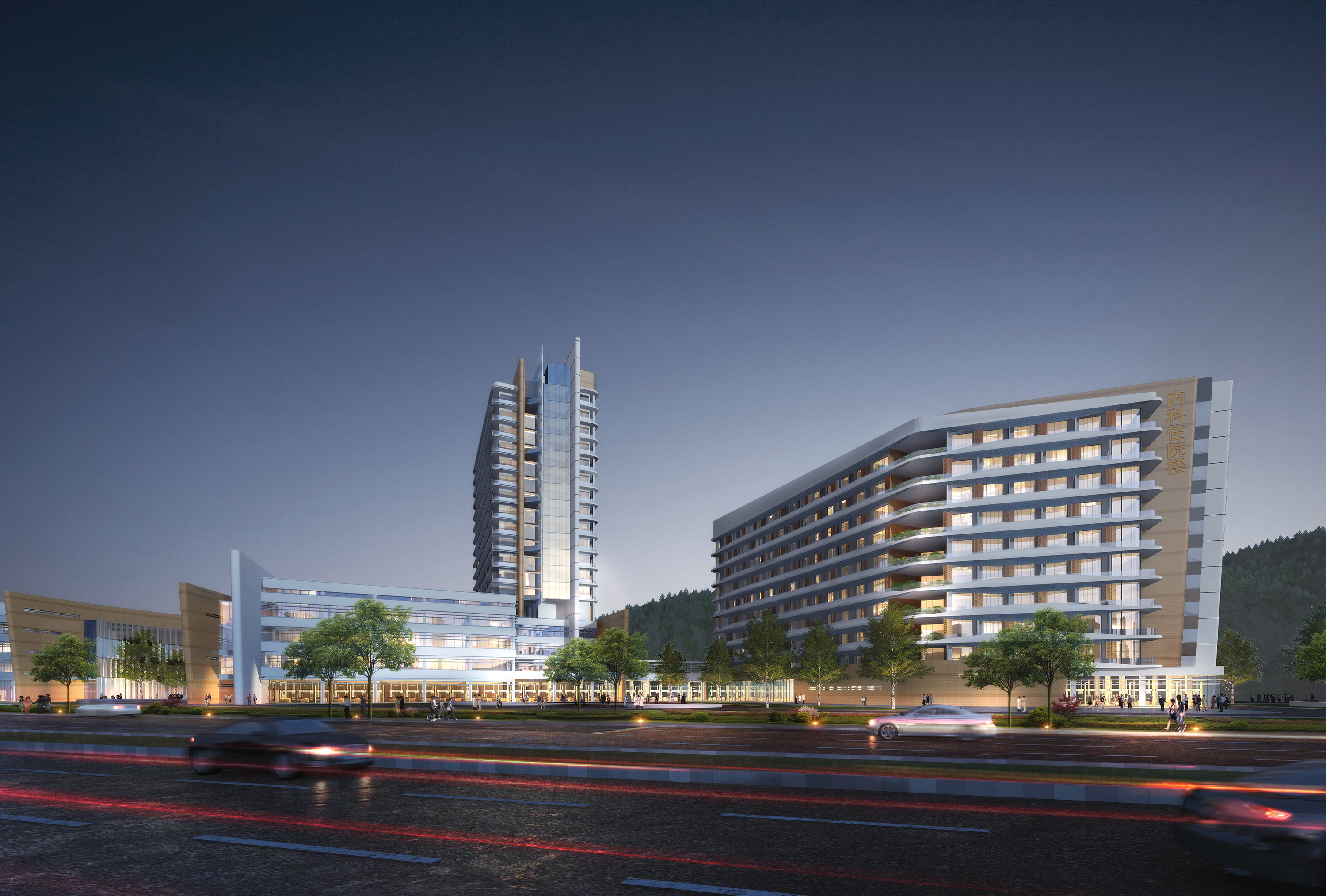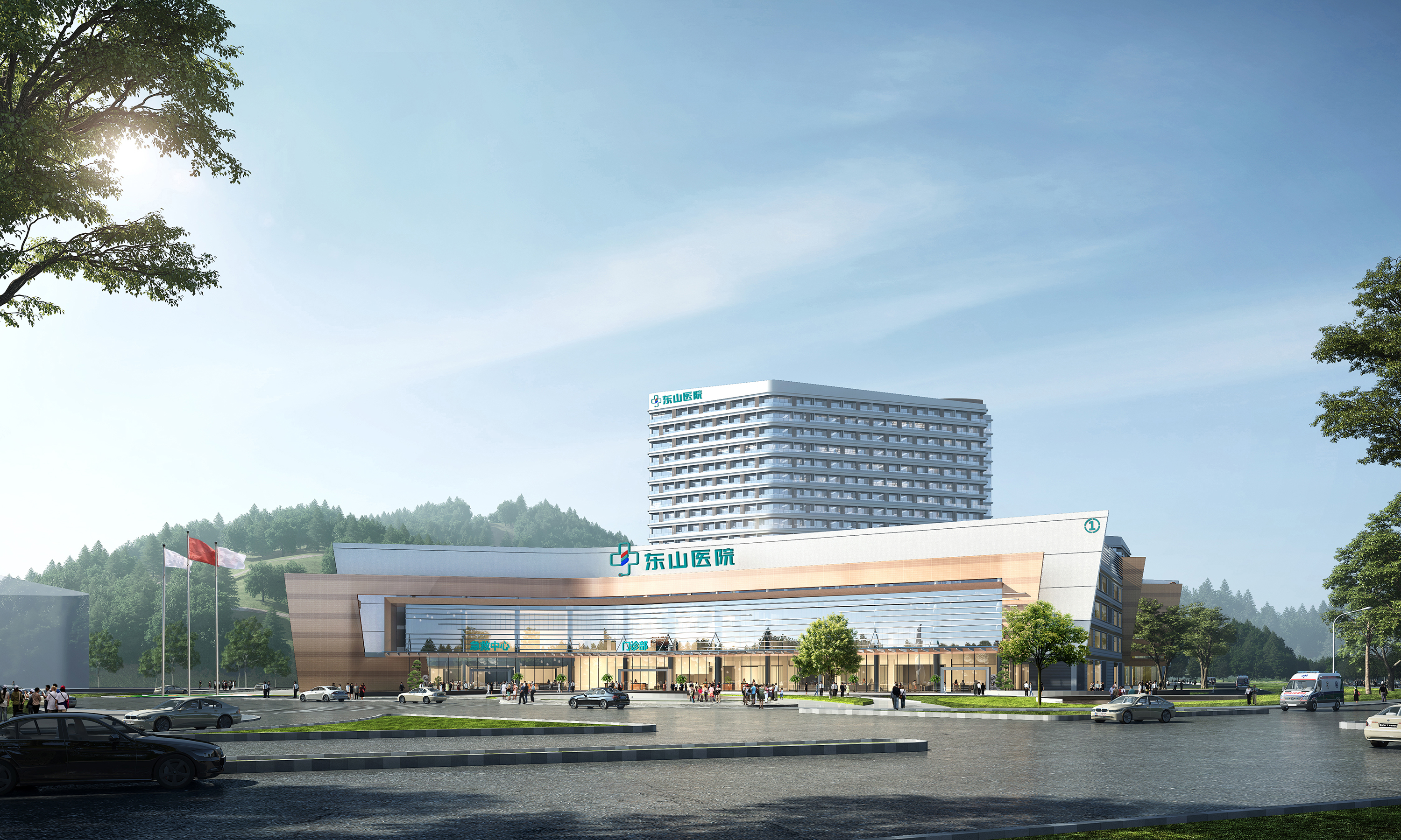 整体布局采用大气、柔顺的建筑线条与构件,与曲线型的景观元素,打造一个没有尖锐角度的医疗场所。顺畅的布局线条与柔美景观场地结合,打造出一个“盘龙凤舞”的建筑格局,盘踞在东山谷健康小镇的入口山脚下。