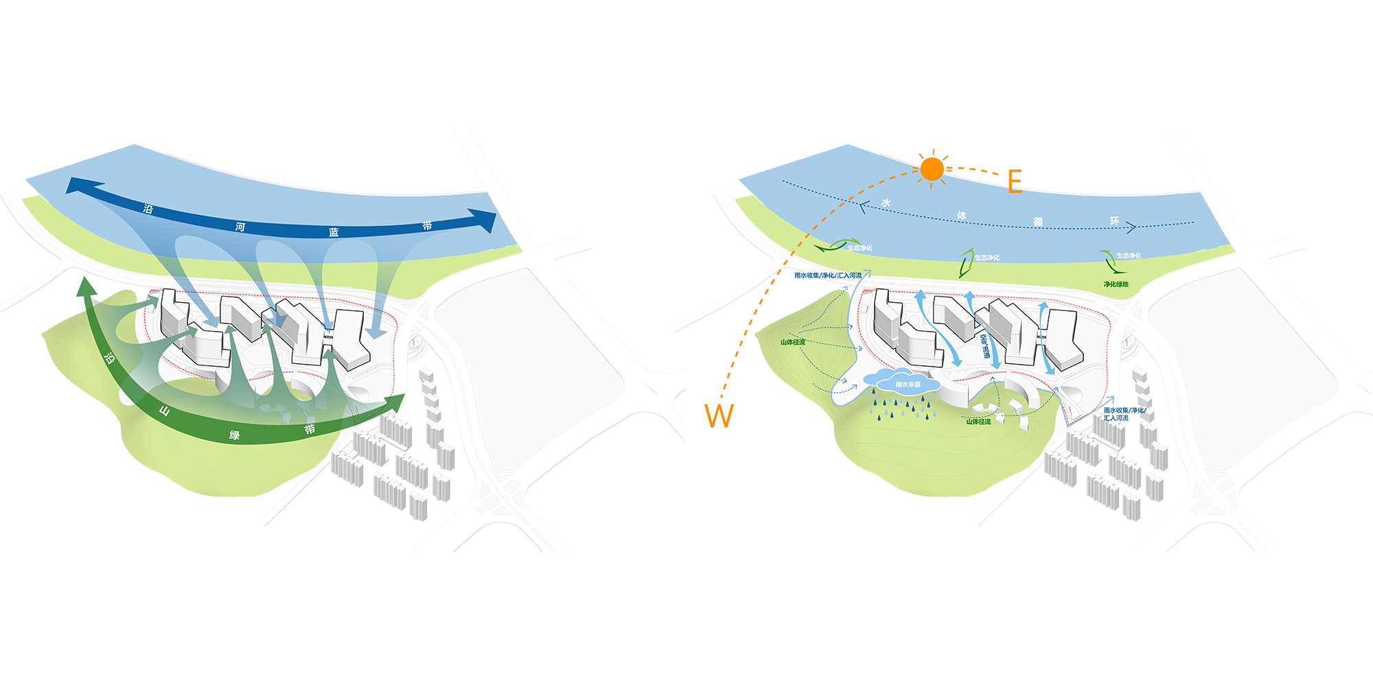 建筑规划呼应沿山与沿河的蓝绿双带肌理,以自然脉络为设计原点,将绵延的山景与灵动的水景作为场地的天然底色。整体布局打破人工与自然的边界,通过景观廊道与开敞的滨水空间,让山与水自然渗透至建筑群中,形成“山-建筑-水”层层递进的视觉层次。清晨薄雾漫过山脊时,窗景便成了流动的水墨画;暮色中河水倒映着灯光,沿岸步道又化作连接生活与自然的纽带,真正实现了“推窗见景,移步换景”的蓝绿交织意境。