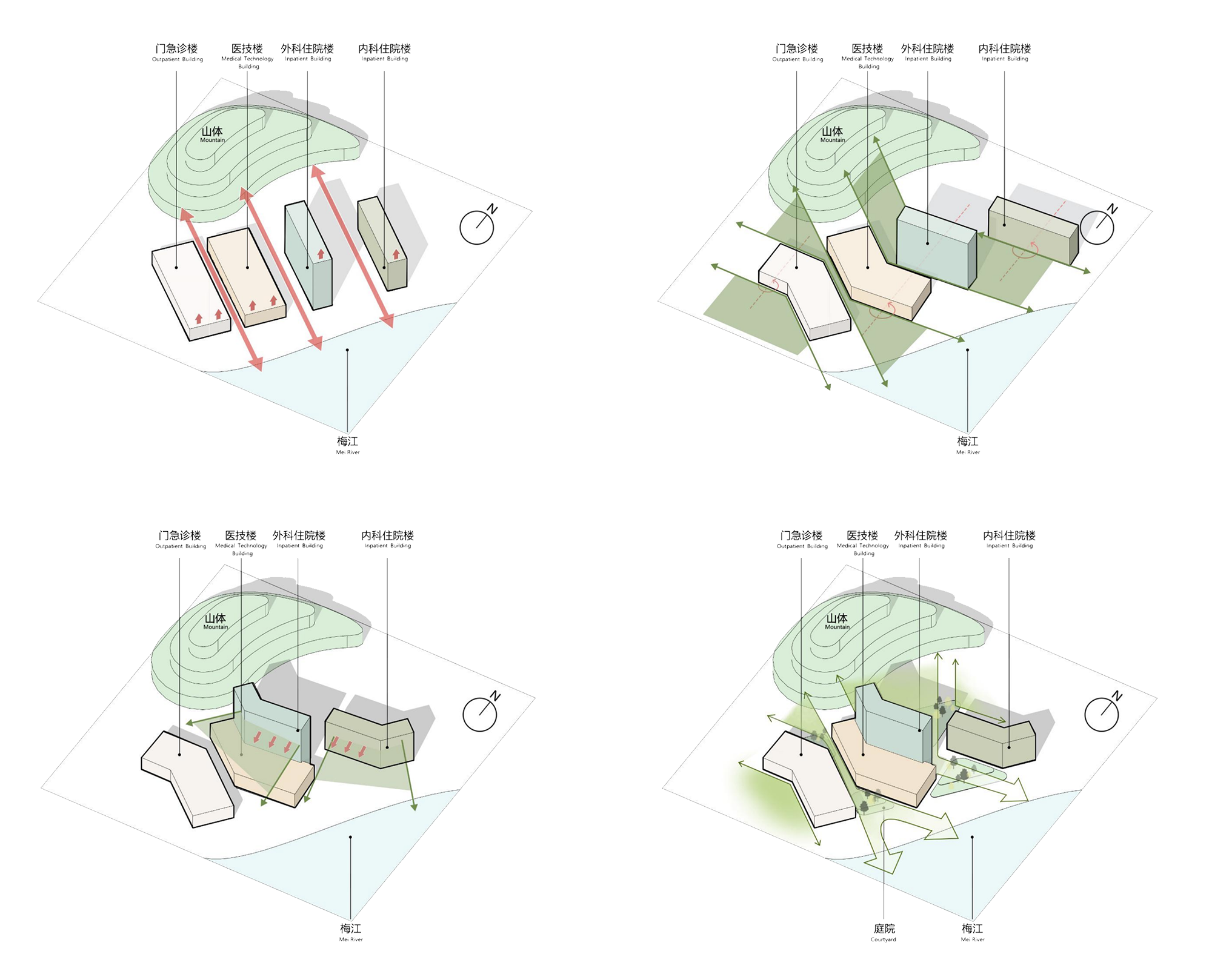 东山医院的幕墙设计秉持“形式追随气候”理念,从广府传统村落冷巷的通风智慧中汲取灵感。其巧妙融合风压与热压通风原理,通过错落的构造引导气流——既借风压引入江面凉爽空气,又凭热压排出室内热气,同时将山林间富含负氧离子的清新气息纳入其中。
