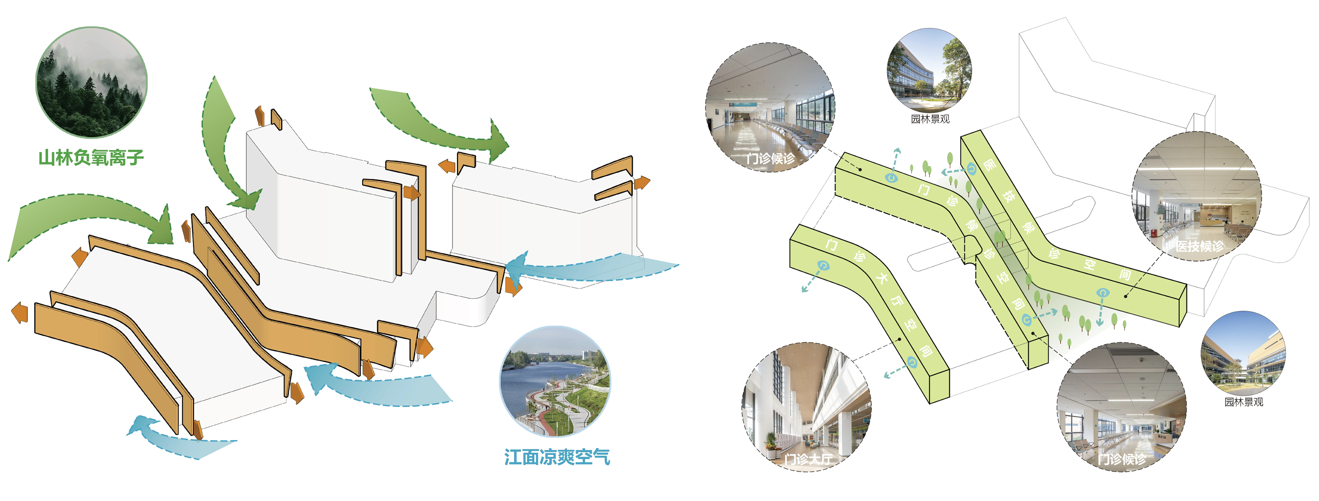 建筑内特意打造的通风景观廊道,不仅成为气流流通的重要通道,更串联起自然景致,让清风伴着绿意与光影流淌。这套系统让建筑如同会呼吸的有机体,以自然之力实现高效通风,为医患营造出舒适宜人的疗愈空间。
