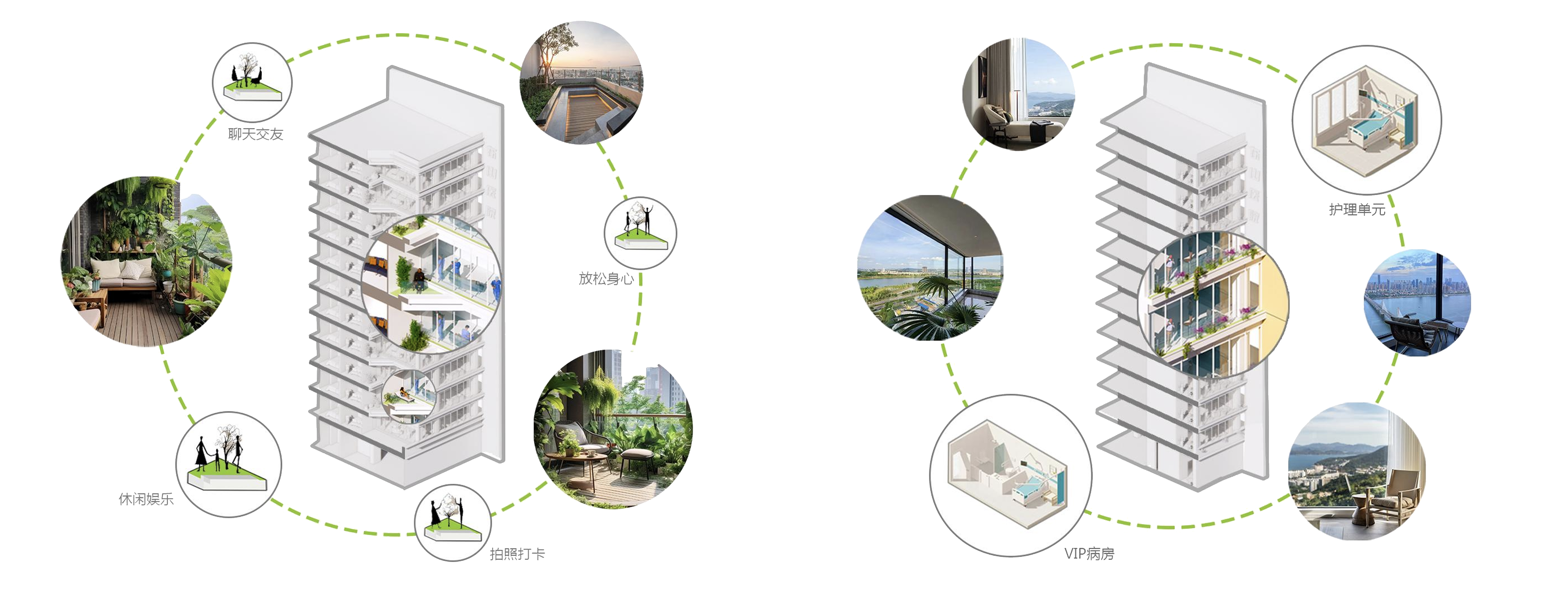 建筑塔楼在住院、诊疗等核心医疗功能之外嵌入了一系列充满生活气息的小空间:或为临窗的聊天角,供患者轻声交流驱散孤独;或设绿植环绕的休憩区,让人在放松中疗愈身心;更有视野开阔的观景平台,成为随手可拍的“打卡点”,让光影与绿意定格成温暖瞬间。