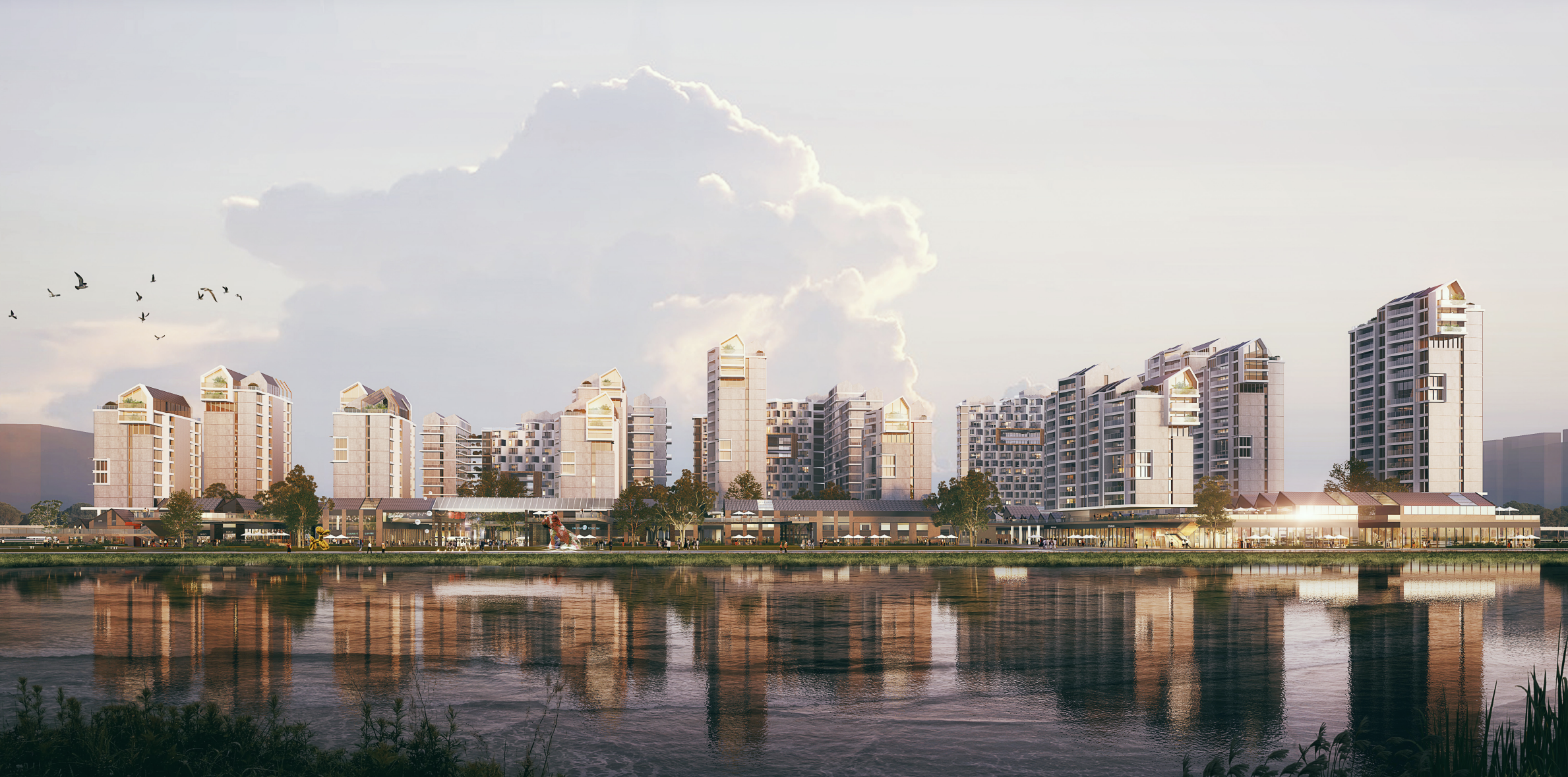第1层级:首层是社区与城市共融的界面,向城市敞开,容纳了商业、零售等功能,将外界的自然与城市活力引入社区内。东侧紧邻社区中心,公共开放性与商业属性更为突出,而西侧则更为私密,专为社区内部居民提供亲近生活的场所。
