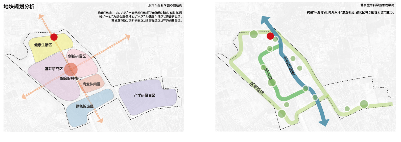 北京生命科学园景观格局:构建“一廊穿引、内外双环”景观格局,强化区域识别性和城市魅力。
