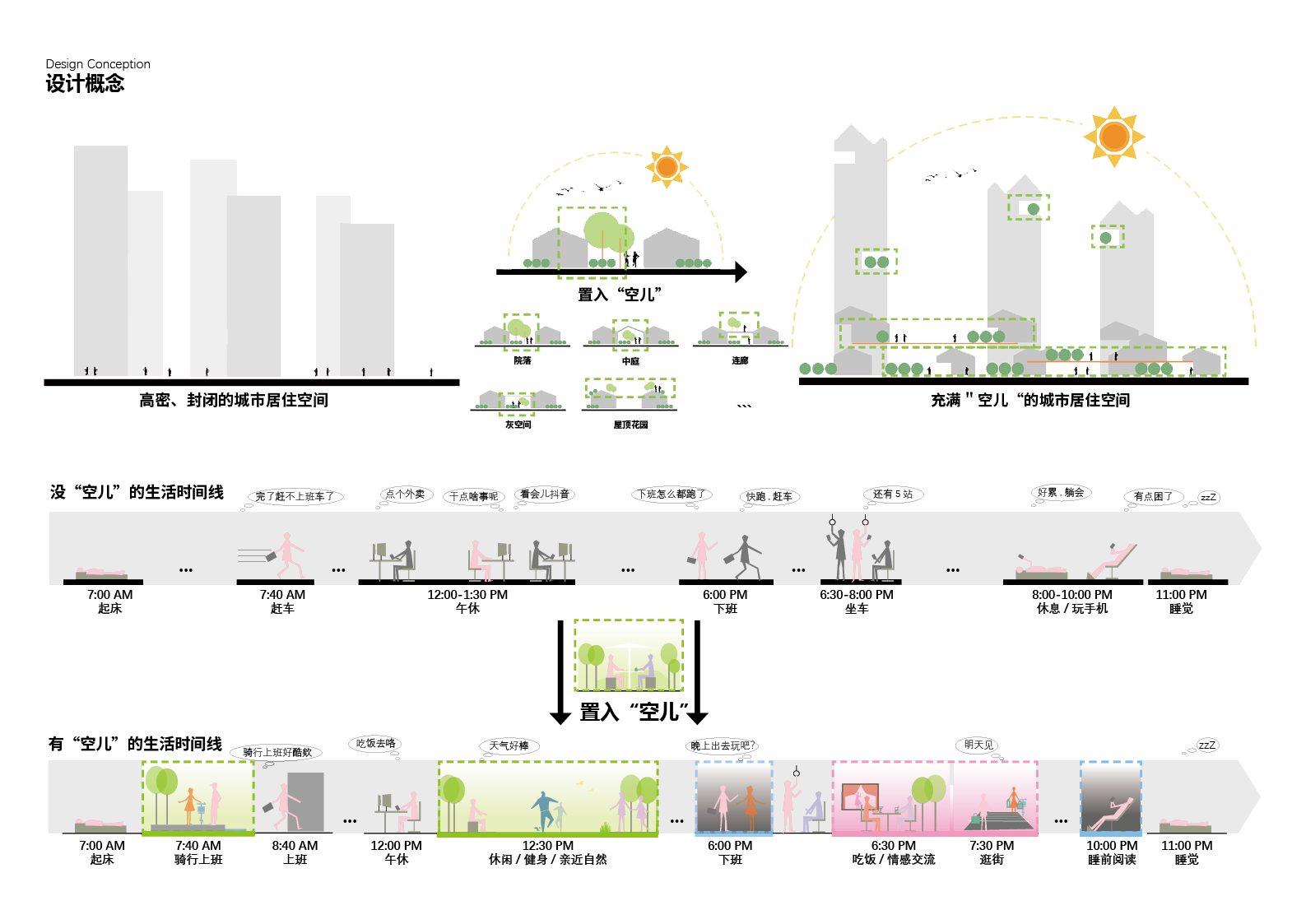 因此,通过在空间设计中融入无数个能够连接内外环境的空儿,将人与人、人与环境联系起来,在这些空儿里,听虫鸣,感受微风、享受阳光、风和空气。