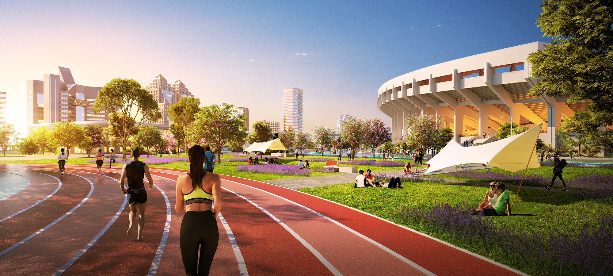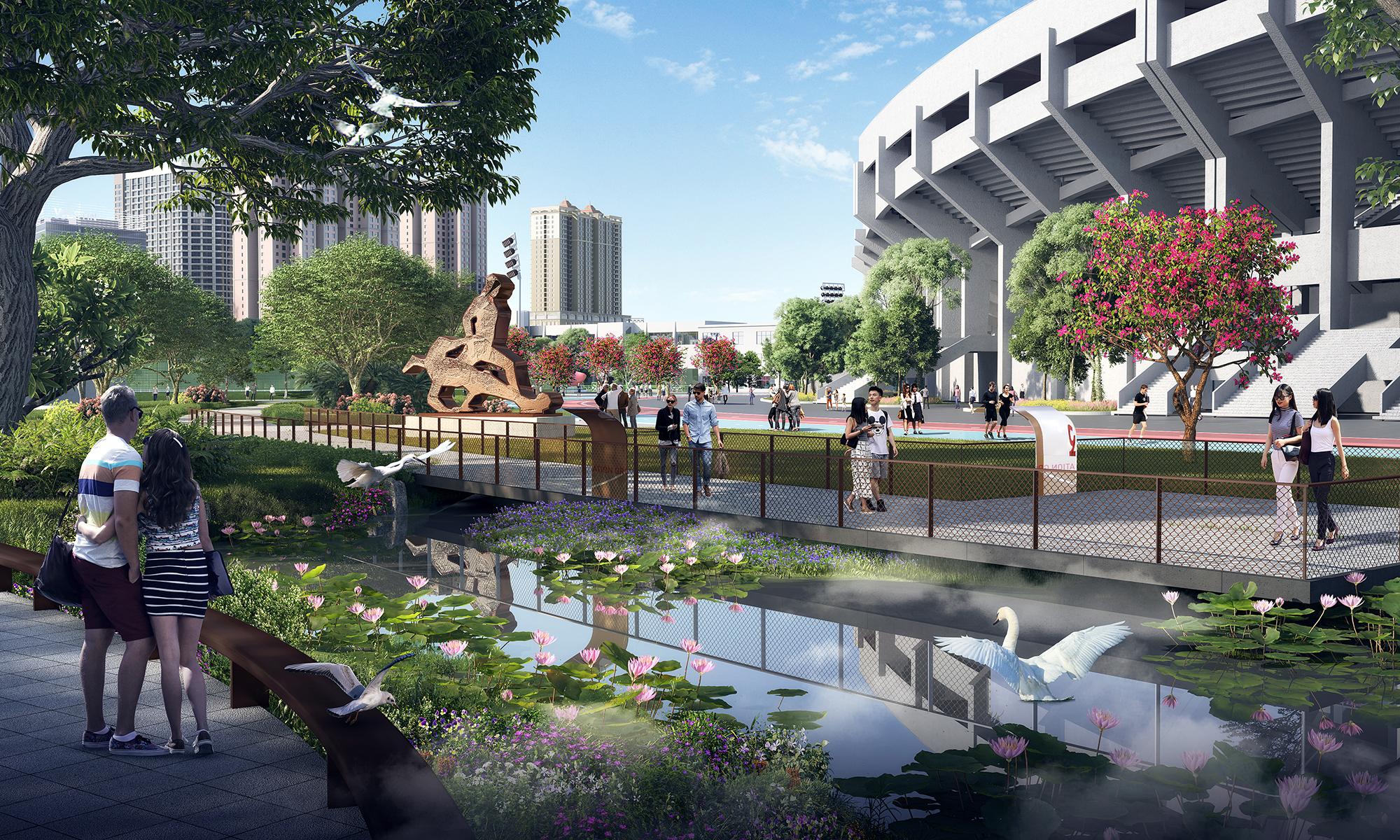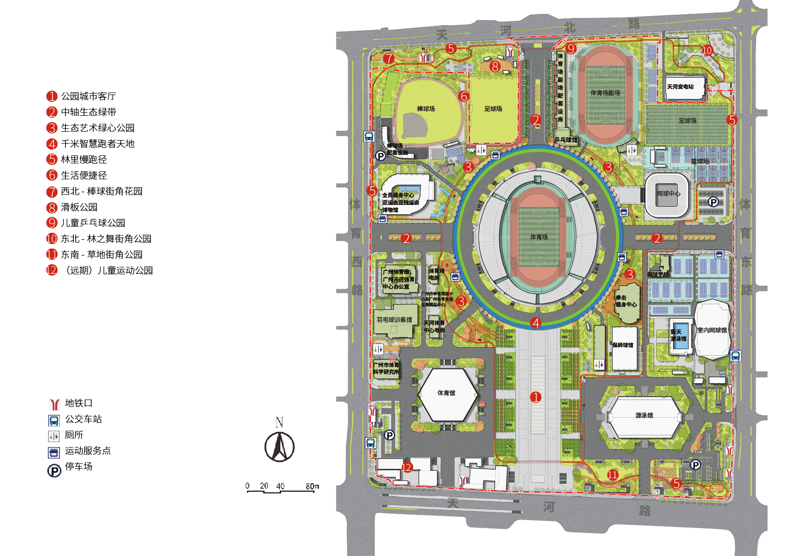 本次改造设计在满足残特奥会开幕式及十五全运会竞赛各项要求的前提下,充分结合赛时、赛后使用需求,将广州天河体育中心打造成市民喜闻乐见、无界穿梭的全民健身体育公园。以“无界人民体育公园”理念,“无界绿心、城园共栖、赛平一体”的策略,采用“双轴、一心、双环、多联”布局,强化城市中轴,修复中心生态绿心,打破孤岛效应,以四角的大型开放绿地链接城市,打造中轴线上无界生态体育公园。