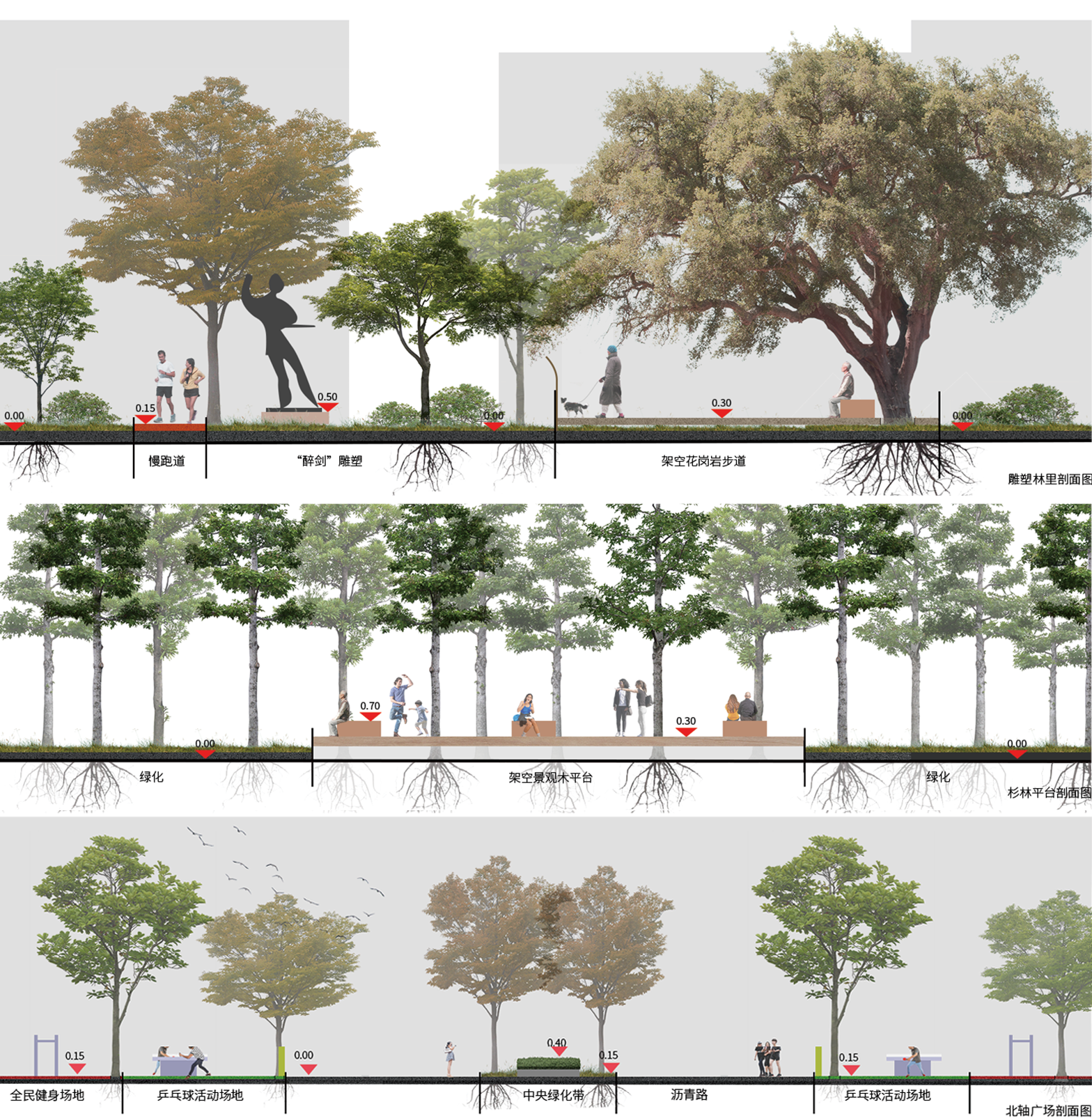 方案翻新地面,提升围网,增加便民储物设施,打造星光大道,林下硬化复绿,提升了中轴的生态绿轴形象。