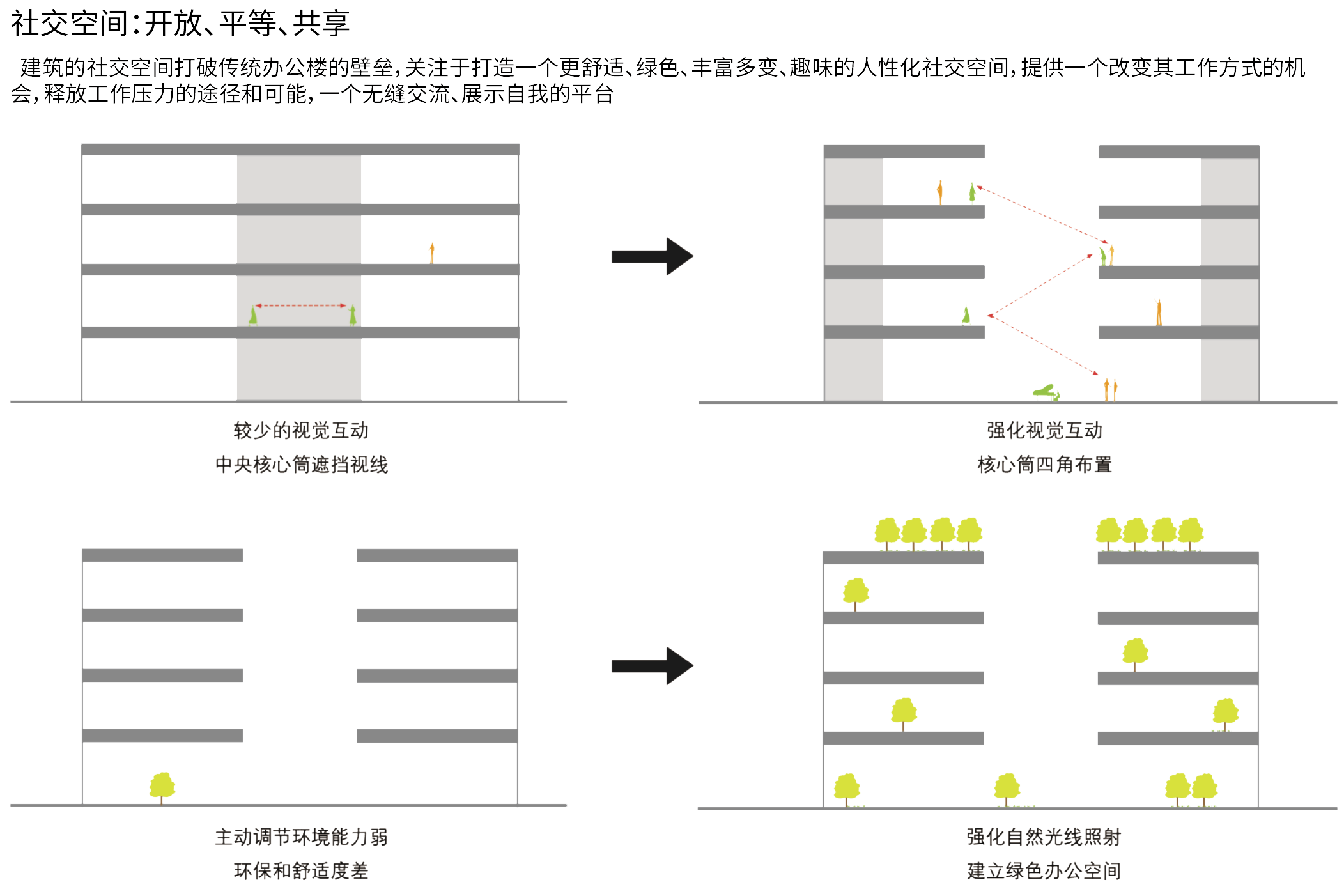 整个空间元素为建筑提供采光、视野以及空气循环,自然形成开放办公相互联系的通道,不同部门和业务之间进行充分的对话,提高生产力,鼓励创新。