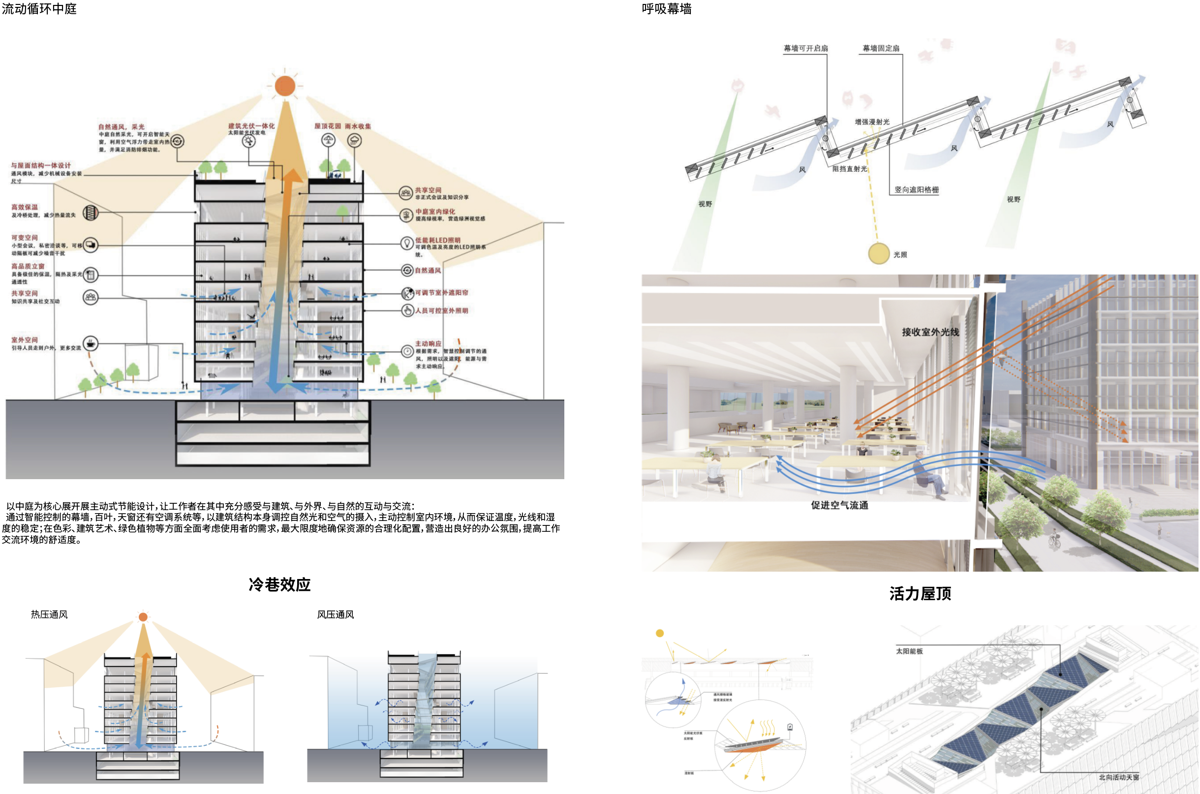通过智能控制的幕墙,百叶,天窗还有空调系统等,以建筑结构本身调控自然光和空气的摄入,主动控制室内环境,从而保证温度,光线和湿度的稳定;在色彩、建筑艺术、绿色植物等方面全面考虑使用者的需求,最大限度地确保资源的合理化配置,营造出良好的办公氛围,提高工作交流环境的舒适度。