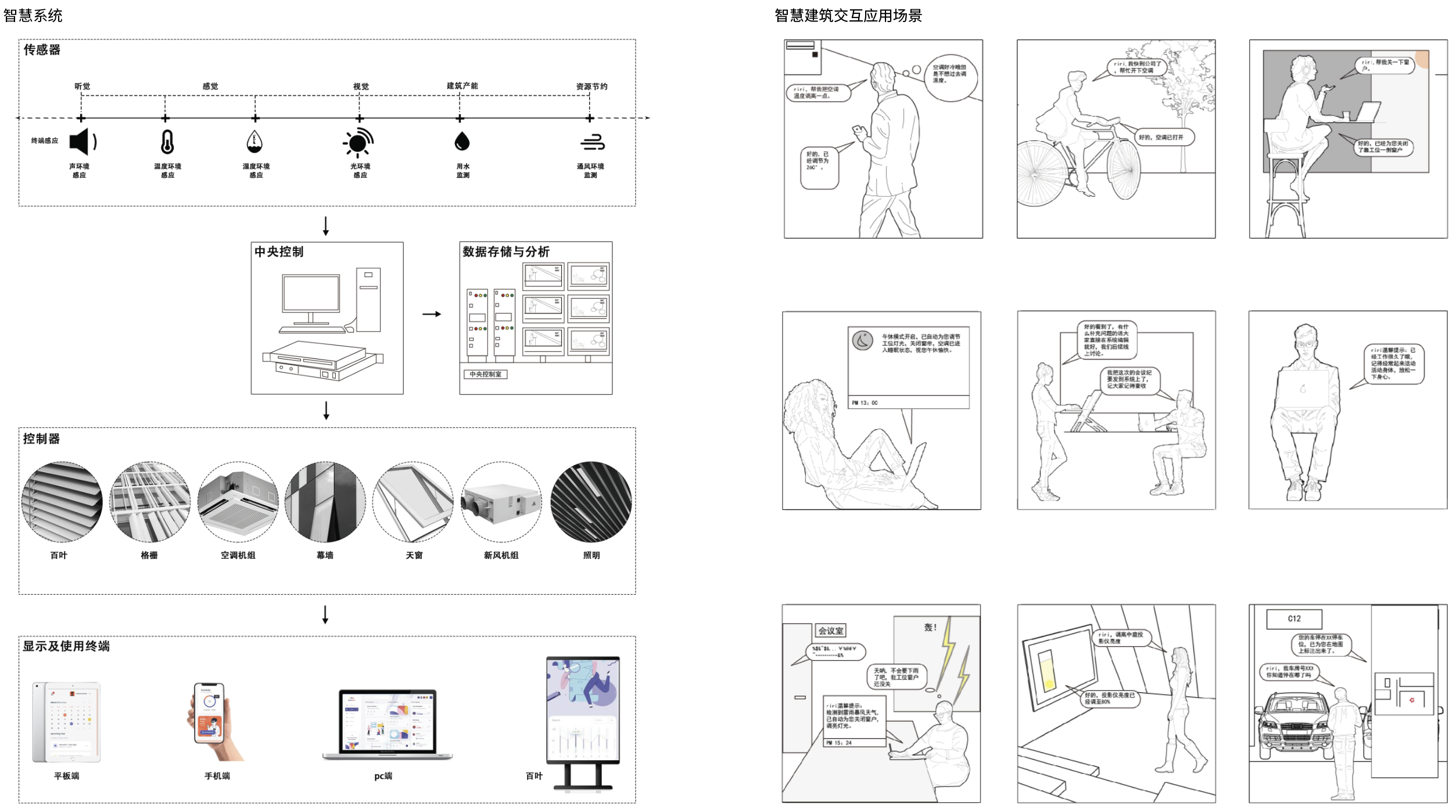 利用大数据收集,智能算法,语音识别等人工技术,以用户目标为设计原驱动力,以用户需求的满足来保障这些目标的有效实现,以人为本的交互设计理念为核心,进行多样化交互方式设计。使用者可以从手机,电脑,平板,以及其他不同场所的适用性端口上对建筑主动式系统操作,进行各种反馈,在不同状态下与建筑进行“交流互动”,提升体验感官,舒适办公状态。